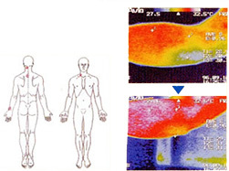 手首や腰・足首などにテープを貼ることによって痛みが改善し、幹部の皮膚温度は0.3~0.8℃下がりました。