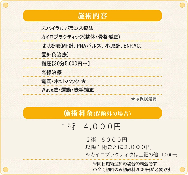 頸椎、腰椎、骨盤のズレを調整することにより痛みなど身体の不調を予防する効果があります。