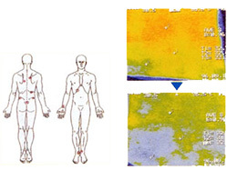 テープをはることによって痛みが改善し、患部の皮膚温度は0.3~1.1℃上昇しました。テープを首や手に張っています。